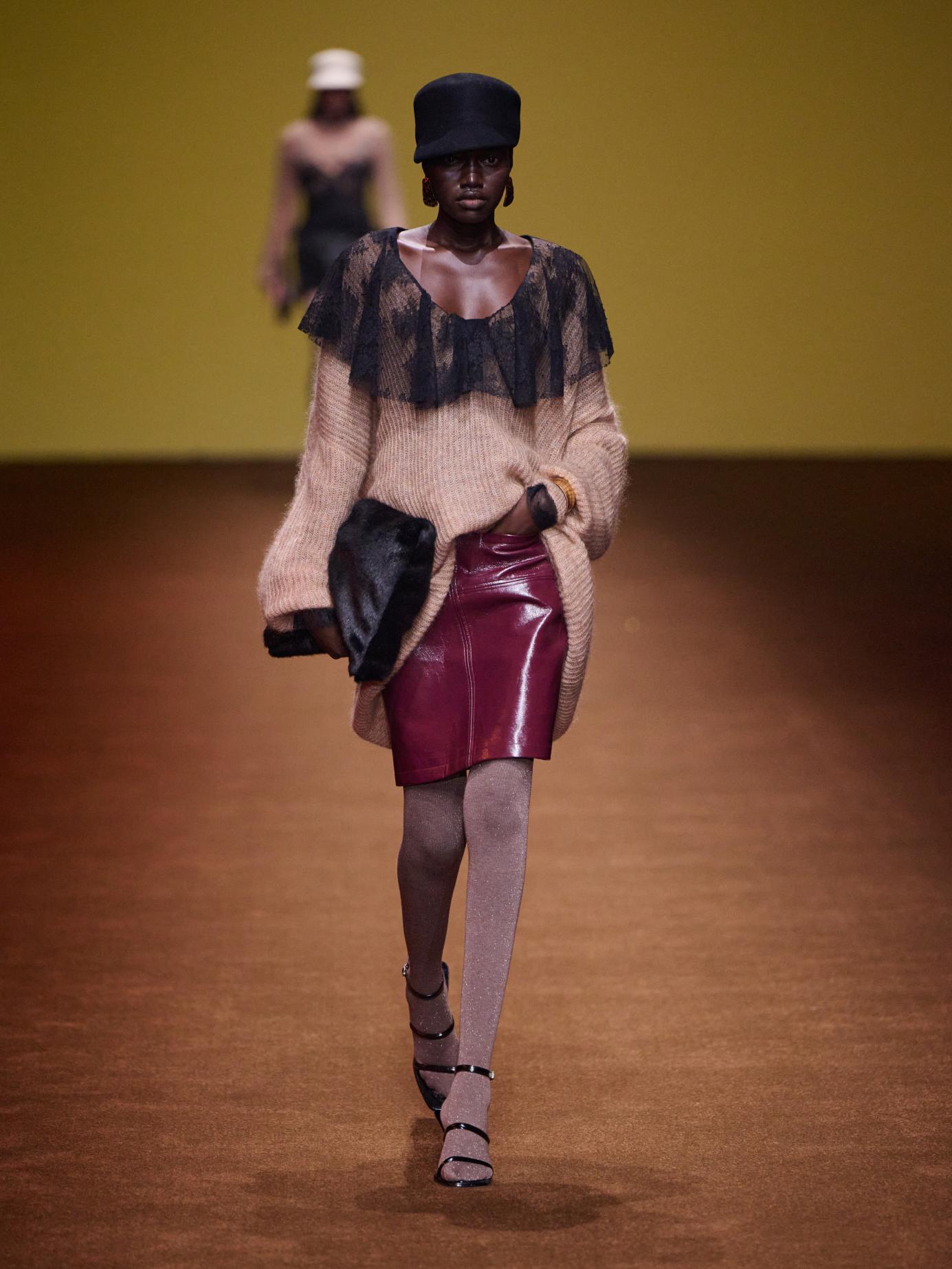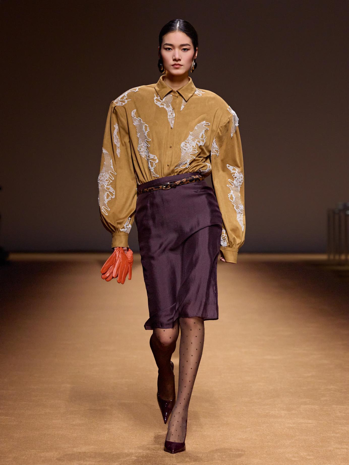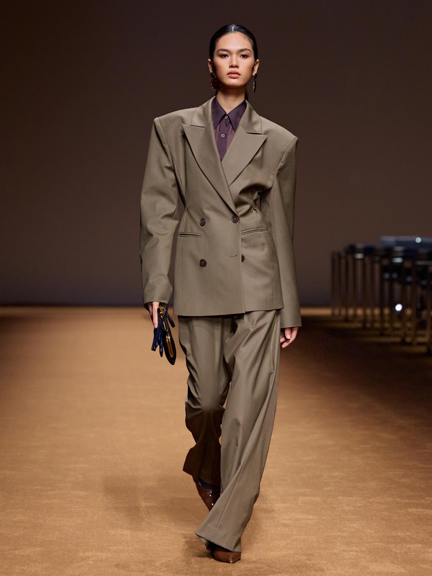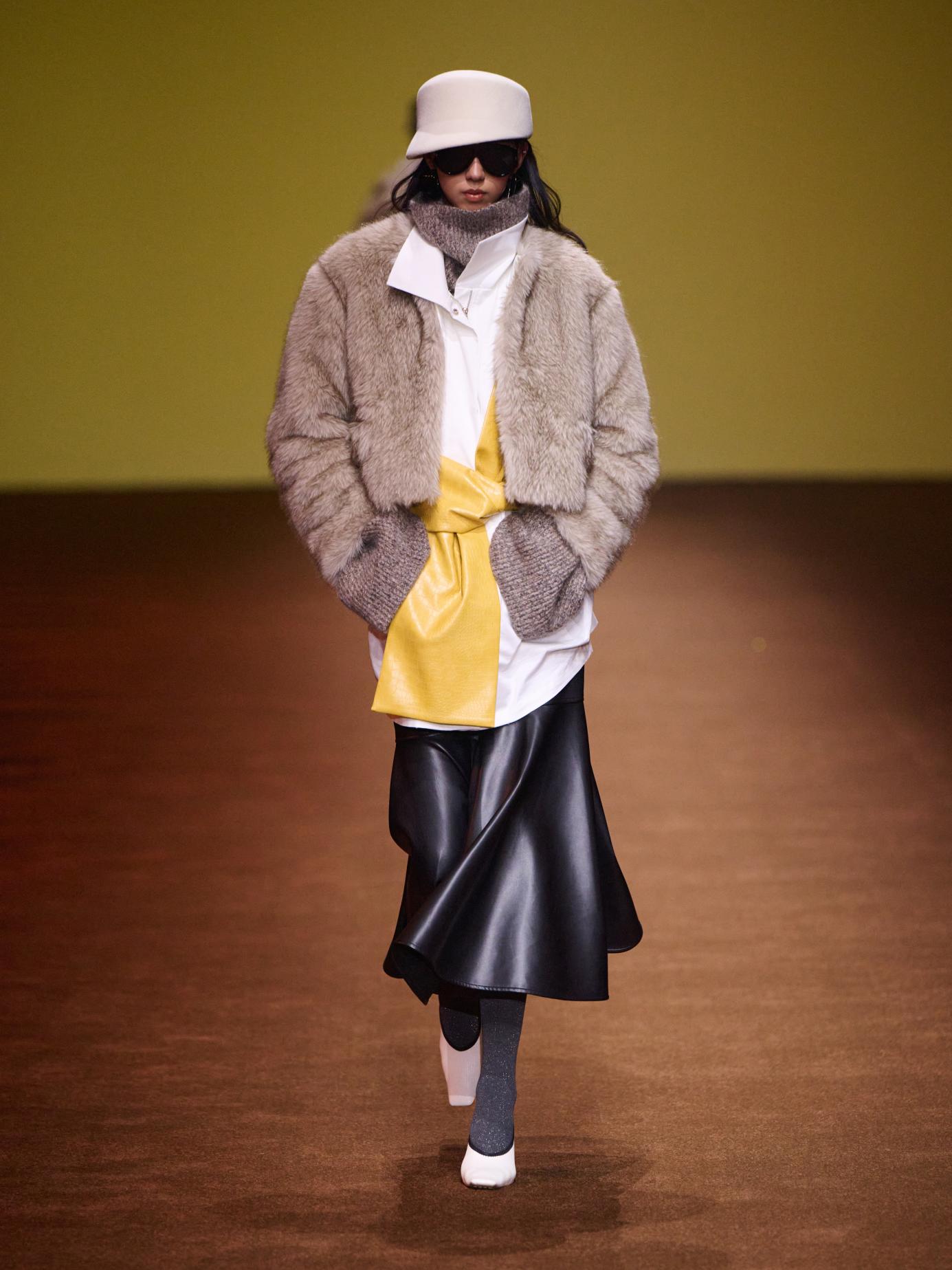 本季,Stivanano以剪裁为笔,让60年代的精致结构与70年代的自由灵魂悄然交织,化作时空交叠的低语。掐腰如诗,勾勒女性曲线的柔韧韵律;Oversized廓形如风,注入行走之间的从容力量。皮革裹挟着时代的坚韧,游走于衣摆的经纬之间;皮草晕染奢华的诗意,温度与气场在肌理间寻得微妙平衡。黑白灰铺陈极简底色,而黄、红、棕、紫如灵感碎片跃动其上,划破沉静,点燃锋芒。柔韧有骨,故而自如生辉。