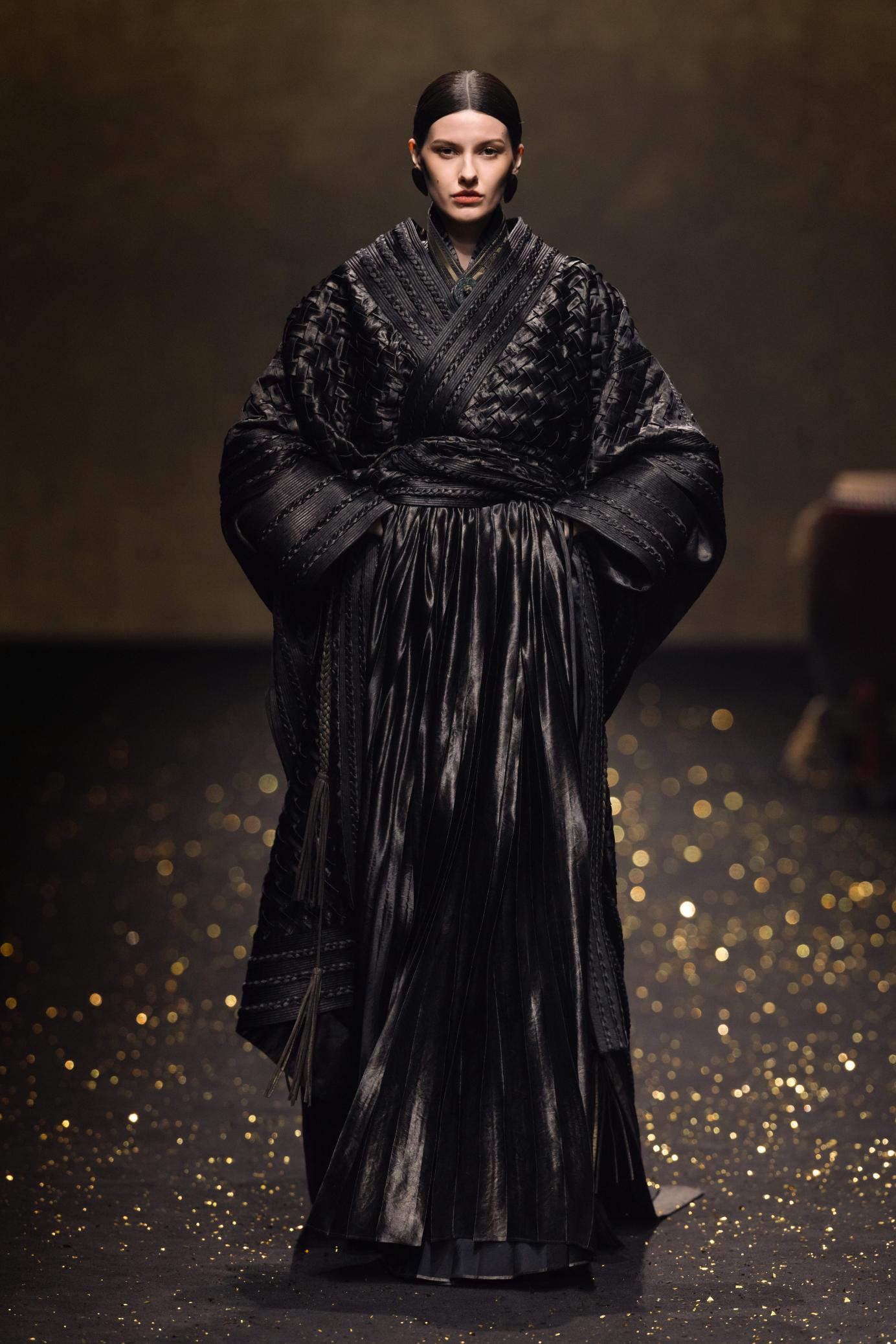 荷木 HEMU 2026秋冬「楚歌」系列作品,以楚文化为设计灵感,让荆楚的魂魄在霓裳之间重生。这是一场跨越时空的对话,是青铜器上饕餮纹与织物上凤鸟纹的共舞,是曲裾深衣与当代设计的融合,是楚辞的浪漫与时尚的对话,是楚歌长风与当下精神的共鸣。